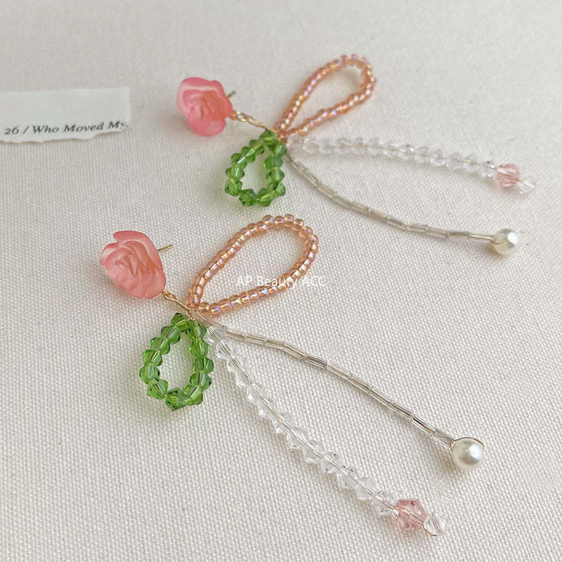 C관 - 글래스 크리스탈 리본 태슬 장미 비즈 귀걸이 [5578] 25.02-3