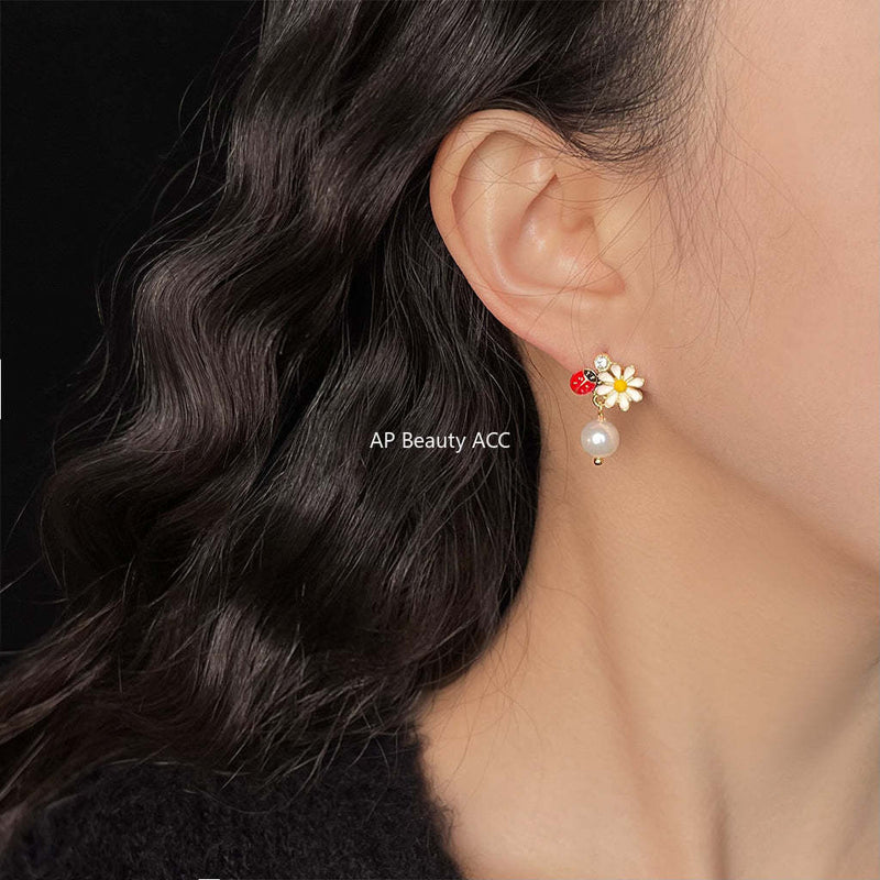 C관 - 14K 도금 은침 무당벌레 데이지 진주 귀걸이 [5591] 25.02-3