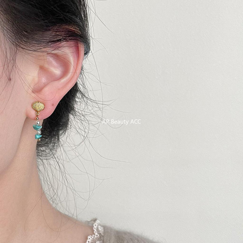 C관 - 14K 도금 오리지날 디자인 핸드 메이드 조개 합성 터키석 은침 귀걸이 [3634] 24.03-4