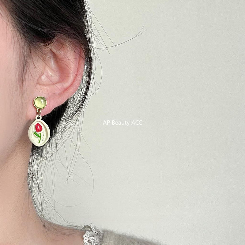 C관 - 14K 도금 봄 여름 튤립 유리 묘안석 에나멜 귀걸이 [3673-3674] 24.03-4