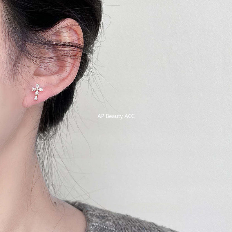 C관 - 미니 큐빅 십자가 로즈 골드 도금 은침 귀걸이 [3736] 24.04-1