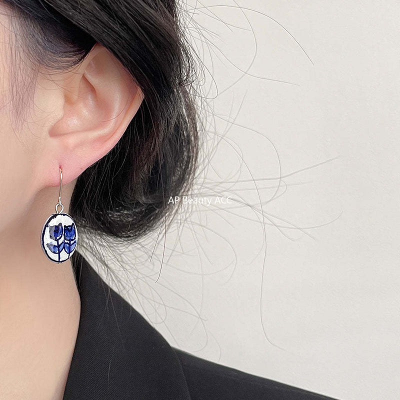 C관 - 청화 도자기 수공예 손그림 고전적 꽃 귀걸이 [3762] 24.04-1