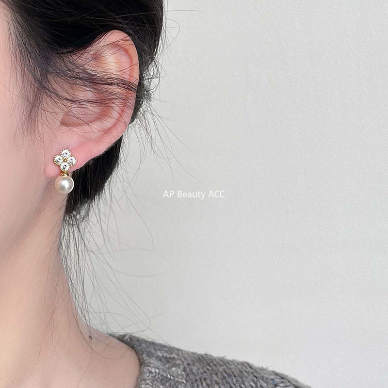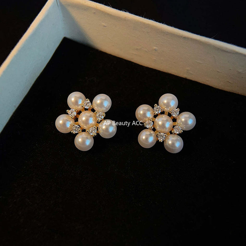 C관 - 프렌치 복고풍 미니 큐빅 진주 꽃 14K 도금 은침 귀걸이 [3768] 24.04-3