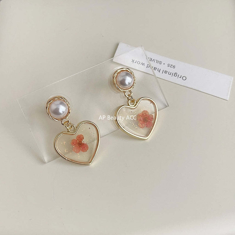 C관 - 숲 속 스타일 진 건조 꽃 오일 코팅 하트 수공예 14K 도금 은침 귀걸이 [3697] 24.04-2