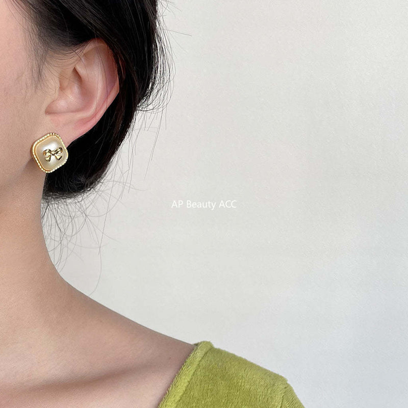 C관 - 고급스러운 사각형 기하학 진주 리본 14K 도금 우아한 귀걸이 [3863] 24.04-3