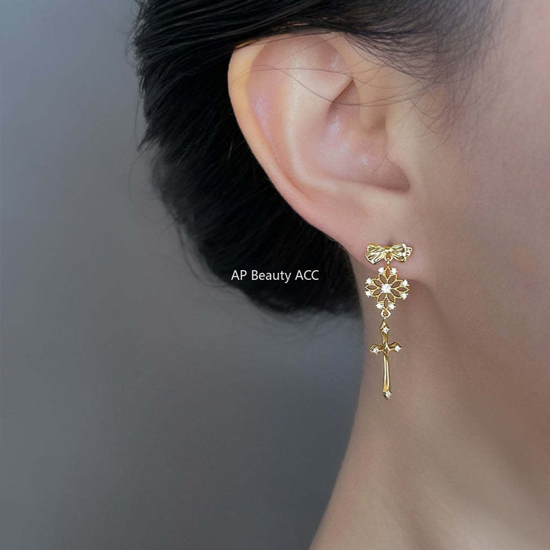 C관 - 925 은침 14K 도금 레이스 십자가 리본 귀걸이 [6828] 25.09-4