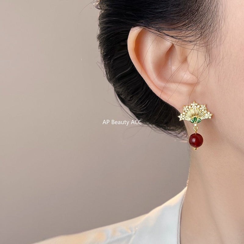 C관 - 925 은침 홍마노 부채 디자인 미니 큐빅 귀걸이 [7041] 25.11-1