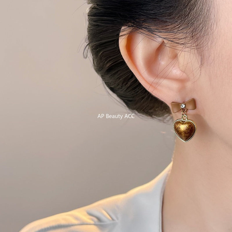 C관 - 925 은침 브라운 큐빅 리본 하트 모양 귀걸이 [7018] 25.11-1