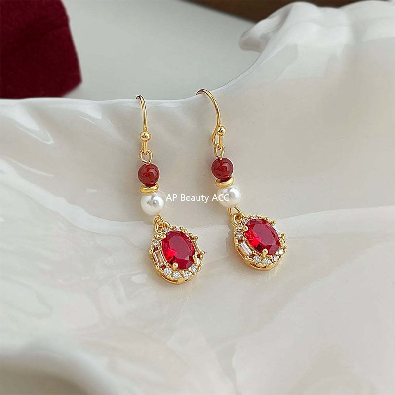 C관 - 풀큐빅 홍마노 진주 롱 드롭 핸드메이드 귀걸이 [7028] 25.11-1