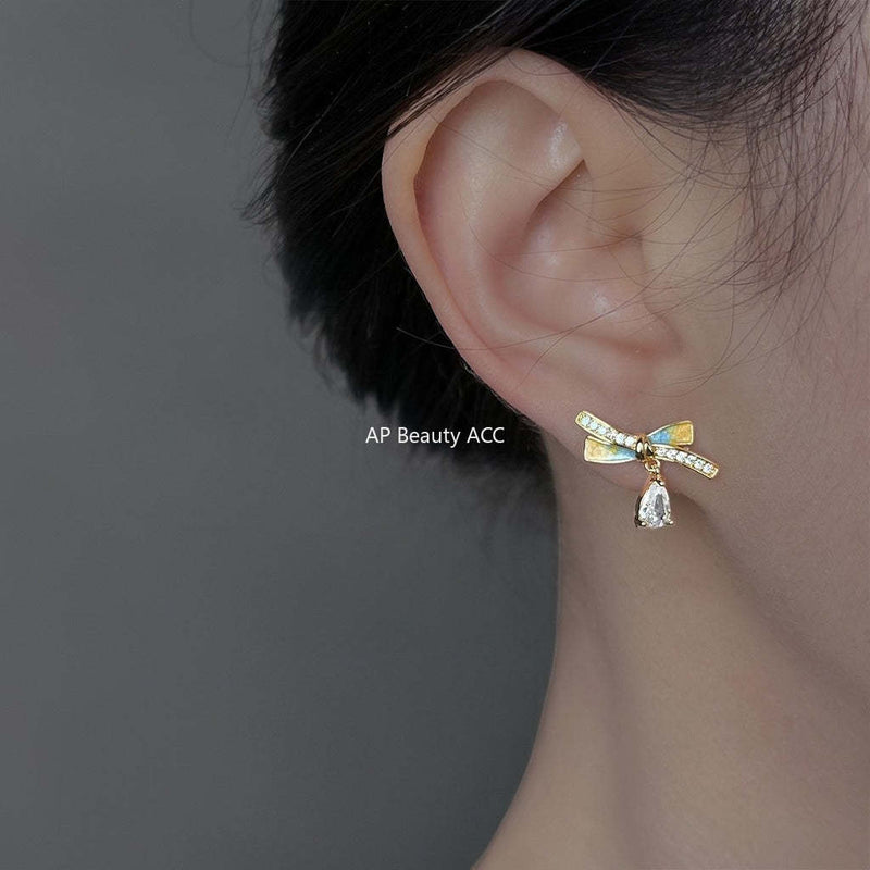 C관 - 큐빅 925 은침 14K 도금 핸드페인팅 리본 귀걸이 [6721] 25.09-4