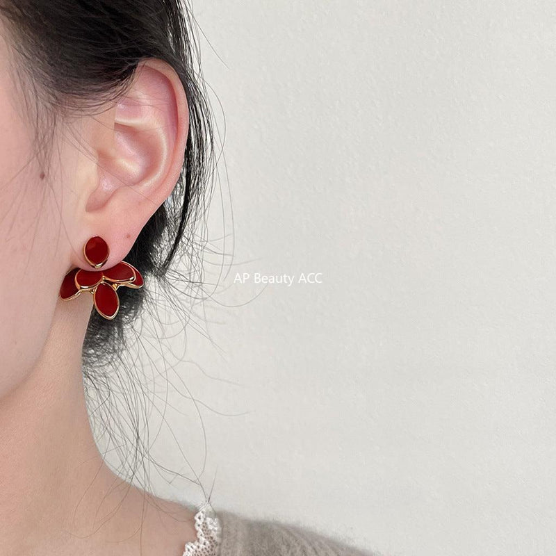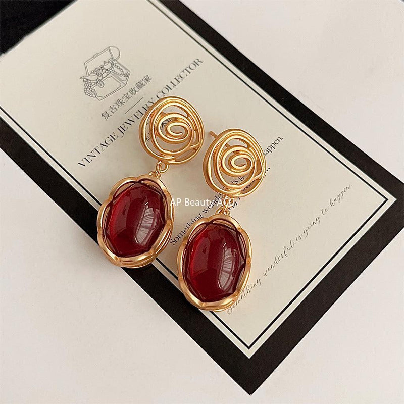 C관 - 14K 도금 홍콩 스타일 빈티지 와인 레드 타원형 에나멜 귀걸이 [3638] 24.03-4