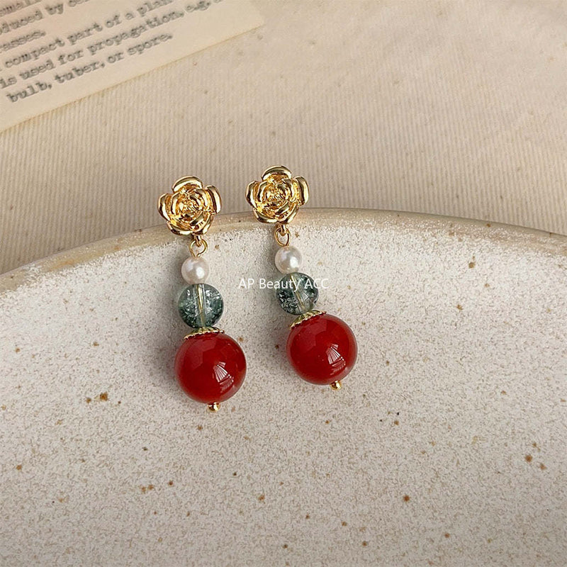 C관 - 14K 도금 홍마노 핸드메이드 복고풍 장미꽃 글라스 크리스탈 은침 귀걸이 [3759] 24.04-1