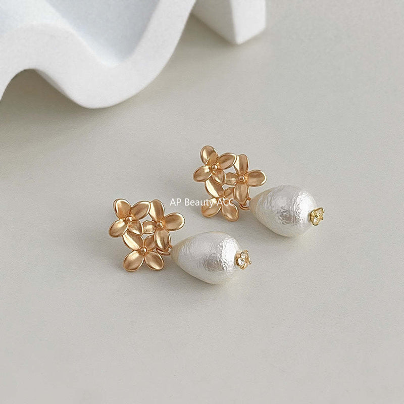 C관 - 코튼펄 고급스러운 꽃잎 무광 도금 은침 물방울 귀걸이 [3871] 24.04-4