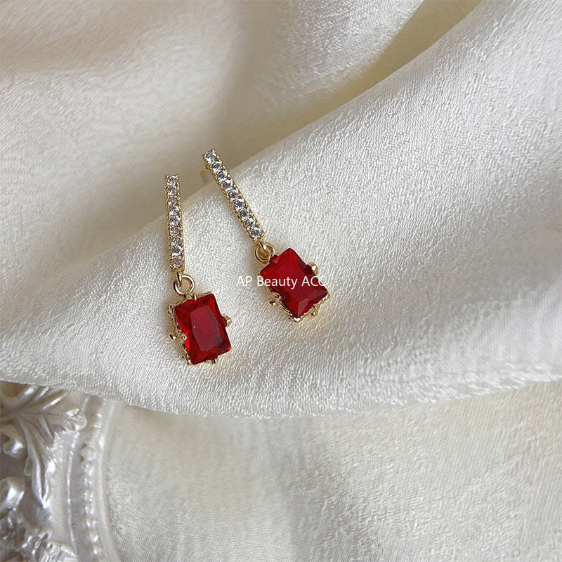 C관 - 14K 도금 큐빅 와인 레드 사각형 복고풍 귀걸이 [4235] 24.07-1