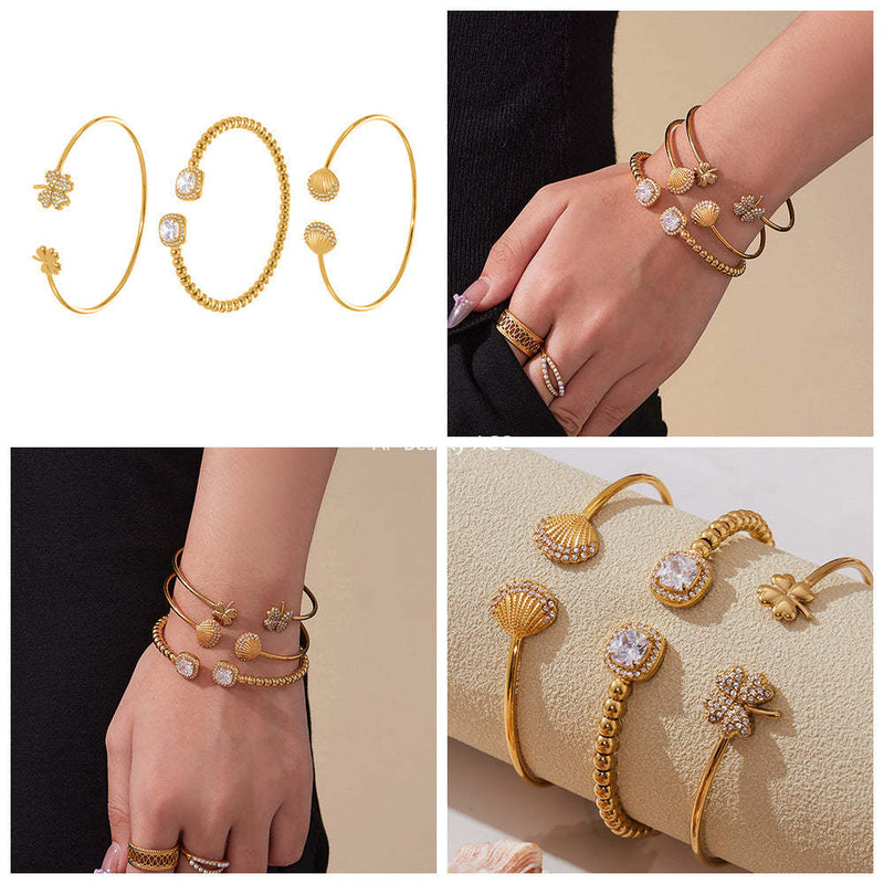 D관 - 스테인리스 18K 도금 큐빅 스틸볼 클로버 오픈형 팔찌 [Z503-Z504-Z505] 25.10-5