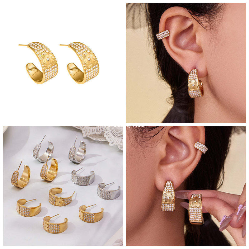 D관 - 스테인리스 18K 도금 빈티지 C자형 풀큐빅 플라워 귀걸이 [F954-F983] 25.10-5