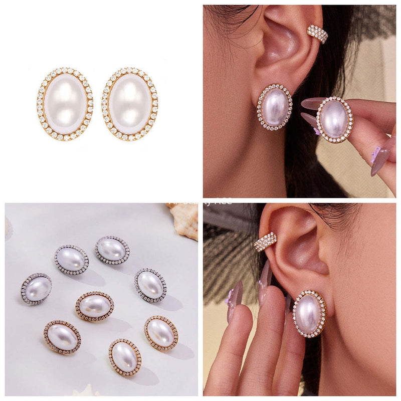 D관 - 스테인리스 18K 도금 타원형 자개진주 큐빅 귀걸이 [F793-F983] 25.10-5