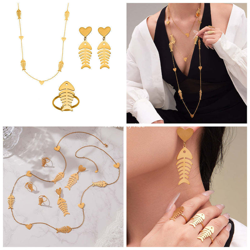 D관 - 스테인리스 18K 도금 물고기뼈 하트 디자인 목걸이 귀걸이 반지 [TXP459] 25.10-5