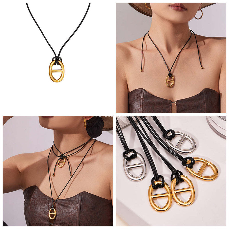 D관 - 돼지코 펜던트 레더 스트랩 스테인리스 롱 목걸이 [P1701] 25.11-3