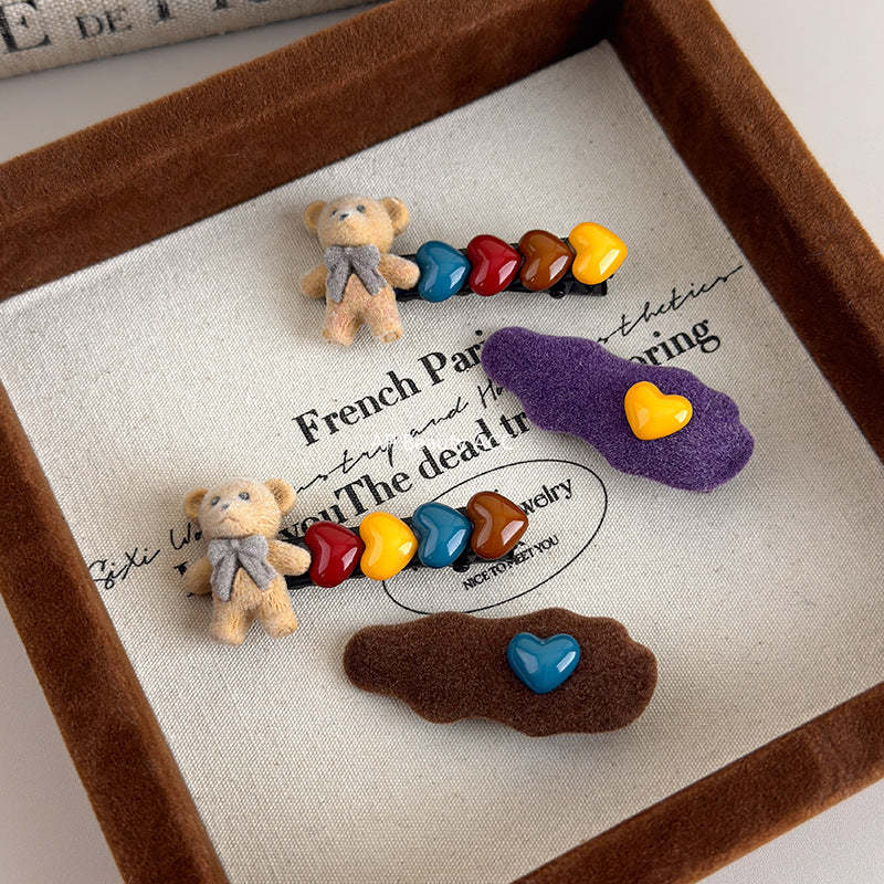 E관 - 벨벳 곰 하트 장식 사이드 앞머리 헤어핀 [27596] 25.10-4