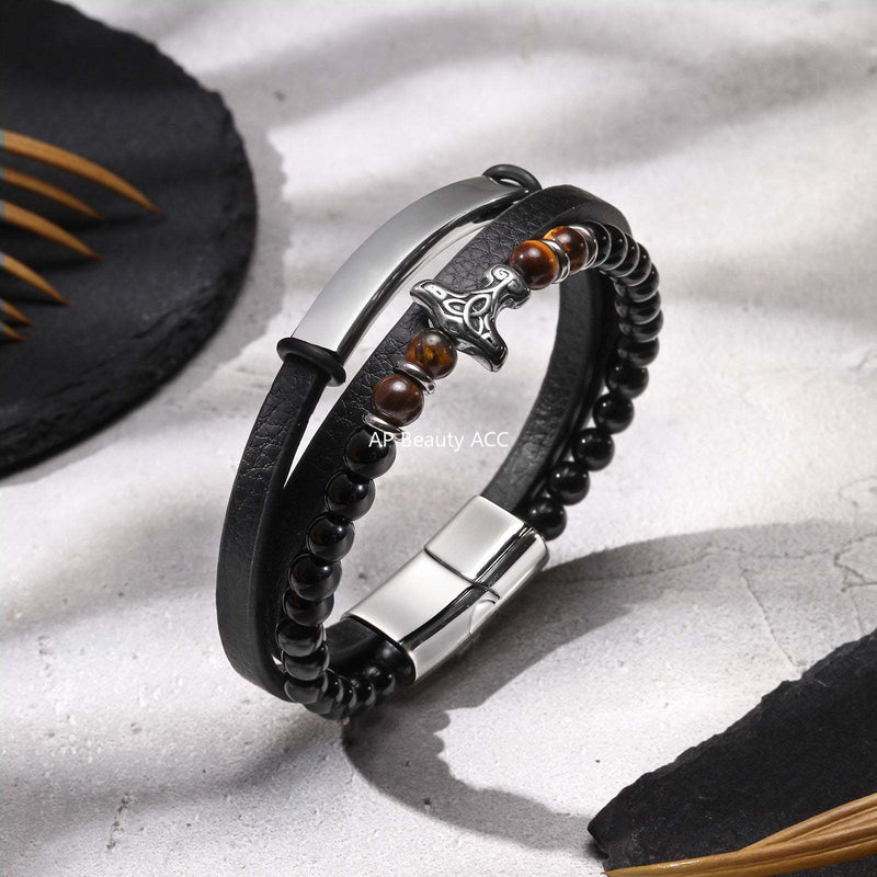 G관 - 스테인리스 마노 호안석 트리플 레이어 가죽끈 팔찌 [BL-734] 25.10-5